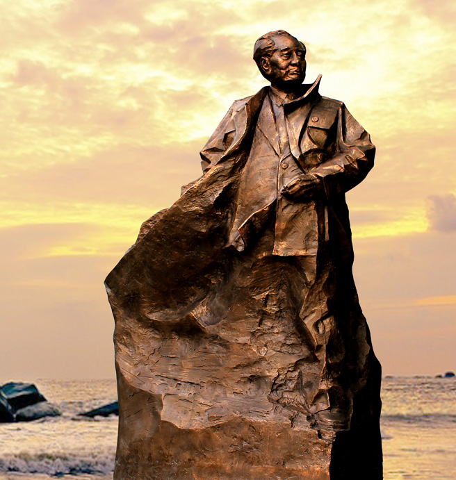 “愈益完美”是在雕塑的情動之美里展現出來,雕塑塑造的并不是個暗啞的人,而是有內中情動,用一種人類崇高的方式表達出來,你可以理解無聲,但卻掩蓋不了洶涌在作品下,洶涌在大陳島開拓者內心的情動,這與雕塑是暗合的,與大陳島亦是暗合。雕塑用“蒙太奇”的手段,將不同的的人物在不同的時間段活動表達銜接。如電影片段,第一尊“墾拓”雕塑是塑以群雕的形式,有人拾起鐵鍬,有人舉起木夯,還有一人喂哺羊羔,眾人都是不遺余力開拓這片疆域。如同雕塑中塑造的旗幟,迎風鼓動,獵獵作響。旗幟的安插,是一種肯定、一種精神的導引,那一群開拓者如同將士,將士只有在一片不毛之地墾拓,而并非在開拓好了的疆域里征戰。大陳島的開發便也是如此,城市市場飽和,人類情感飽和的狀態下,大陳島的開發是勢之趨,大陳島的未來便也如下面的雕塑,是一種觀望,如第二尊“觀望”雕塑,以山體為型,然卻在這之中的變化間,塑造了一尊老人的面容,他在眺望,眼神深邃堅定,內中透有濃濃的情感,似在望那遲歸的捕魚人,而老人旁邊同樣鑄造一個小男孩,他在看,他海的那邊會是什么,看海上升騰起的紅日,看歸來的父母。對美好事物的信仰,這片土地,寄托的是開拓者的信仰,他們堅信,在努力之下必定結出碩果,而那第三尊“濠濮間想”雕塑便是他們眼中的美好,他們未來生活的境遇會是這樣一幅諧和的畫面,一妙齡少女坐在海邊礁石上,有海鷗逐浪翻涌,人物與自然界相擁,物我相忘。